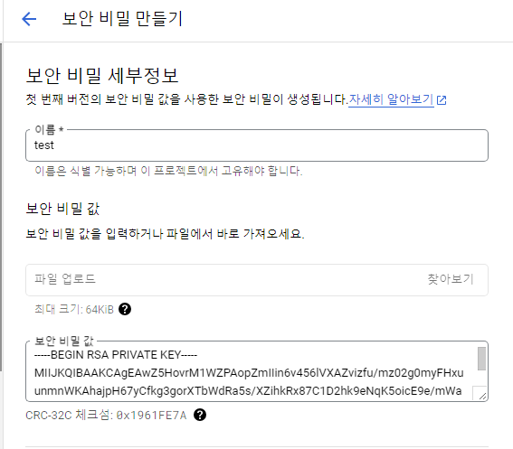 키 생성 이후 로컬로 다운 받은 뒤, 직접 secret manager에 등록하였다.