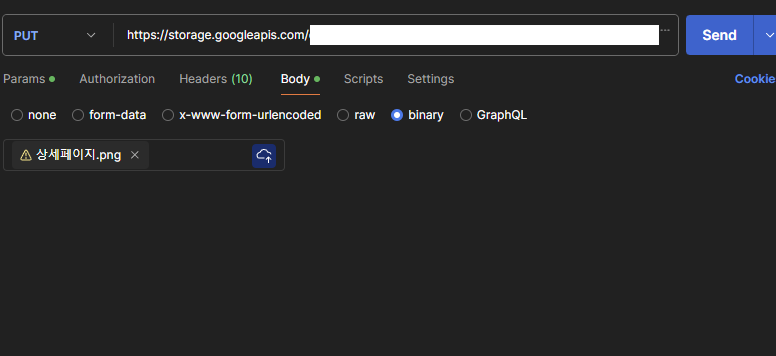 이제 발급된 URL로 PUT 요청을 통해 이미지를 아래와 같이 업로드 하면 된다!